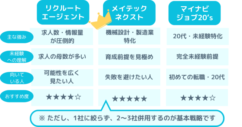 この中ではメイテックネクストが一番おすすめですが、担当者によっては当たりはずれがありますので、1社に絞らず、2~3社併用するのが基本戦略です。
